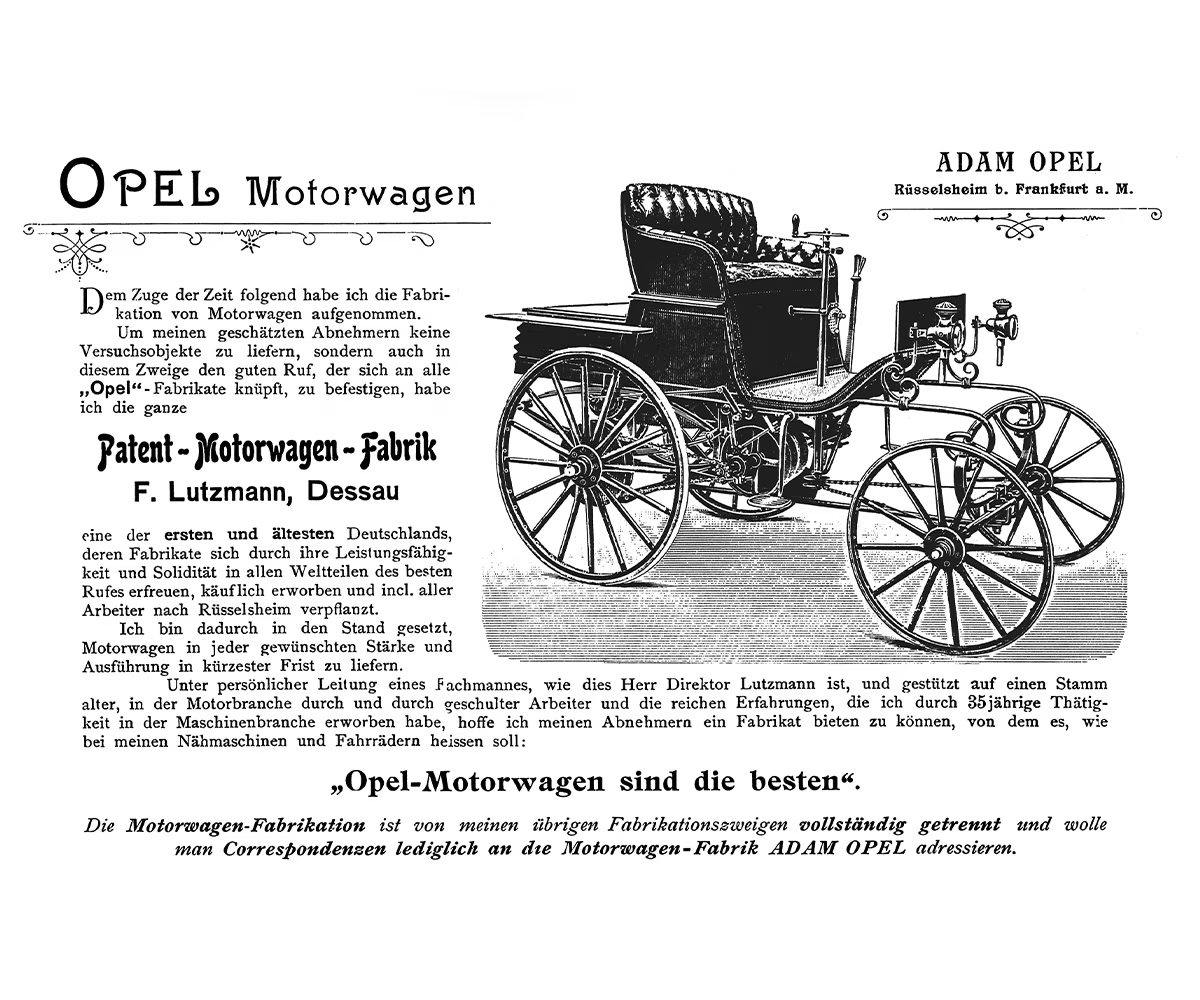 1899. gada 21. janvārī Vilhelms Opels, uzņēmuma dibinātāja Ādama Opela dēls, parakstīja līgumu ar inženieri Frīdrihu Lucmani par viņa Motorwagenfabrik (automobiļu rūpnīcas) iegādi, un tas deva startu auto ražošanai Opel uzņēmumā.